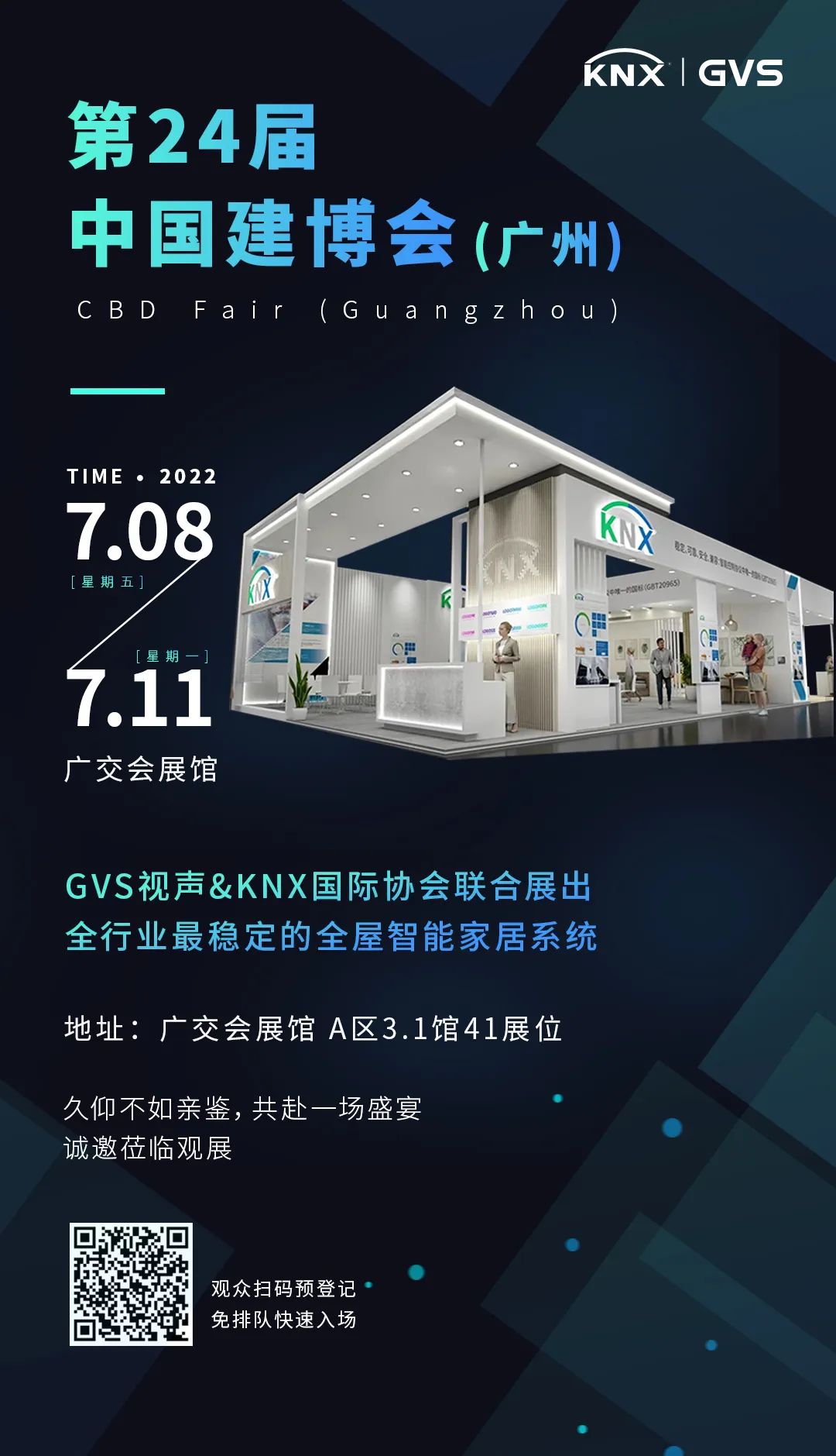2022年7月8日-2022.7月11日,第24届中国建博会(广州),GVS视声与KNX国际协会联合展出全行业最稳定的全屋智能家居系统。