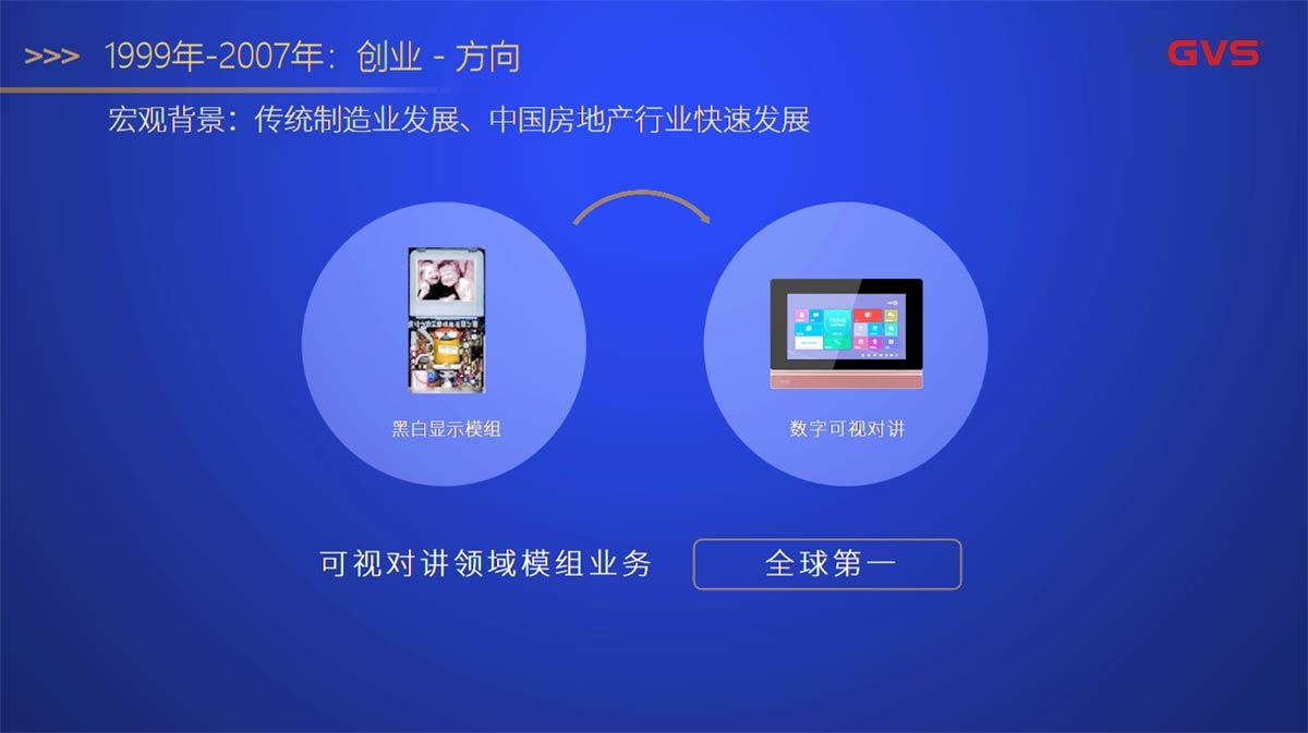 在初心的引导之下,时间回到创业之初的1999年,当时全球仅有两家扁平显像管生产商,分别是三星和索尼,他们的产品价格贵,定制时间长。为了突破国外的技术垄断,GVS视声联合上下游产业链,开发出领先的国产扁平显像管,不仅质量可靠,价格相对进口的扁平显像管大幅下降,交期也大大缩短,对推动中国可视对讲行业发展起到了重要作用,不仅如此,我们的产品还受到了欧美市场认可,远销海外。10年时间,我们用工匠精神做好一款产品,全球市场占有率高达60%以上。