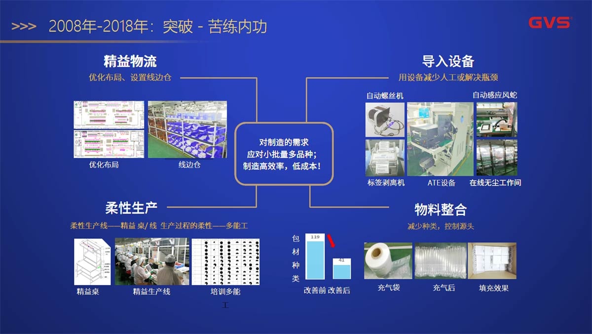 在这第二个十年中,我们成熟了从大批量单一产品的生产模式到小批量多品种生产模式的转换,并且通过改善物流、导入自动化生产线、主动进行物料整合,进行柔性生产线的改造来苦练内功,以应对制造模式的改变并坚持为客户提供高品质的服务。